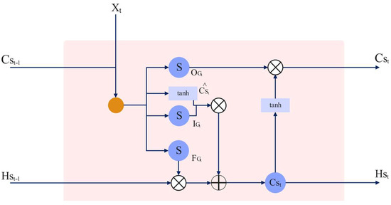 where IGt, OGt, and FGt represent input, output, and forget gates; WI, WO, WF, and WC are weights for each gate; and bF, bC, bO, and bI stand for the bias terms. The logistic sigmoid function is denoted by S, while the hyperbolic tangent function is represented by tanh. The sign is the scalar product of two vectors; and stand for the current and updated cell states, and Xt and signify the input and output of the cell, respectively.