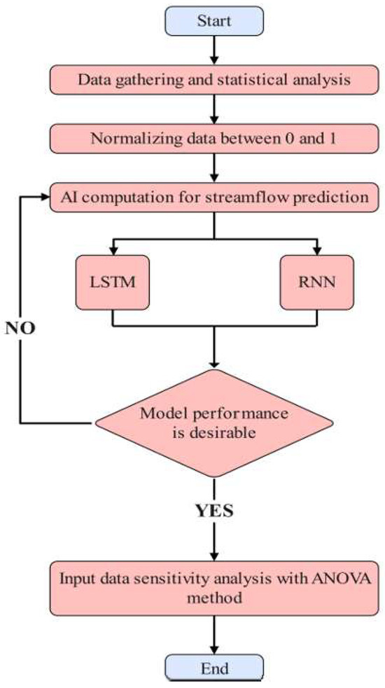In Figure 5, the research roadmap for the study is shown graphically. To predict the Zarrine River’s monthly streamflow, LSTM and RNN networks were used. After thorough data collection, a descriptive statistical analysis was produced. As such, the training, validation and testing sample data for the years 1979–1999 (400 data points), 2004–2014, and 1999–2004 (a total of 87 data points) were studied, respectively (117 data points). The testing dataset contains information that was excluded from the training phase in order to assess the effectiveness of the calculative algorithm. In contrast, overfitting is avoided by using the validation dataset to identify the ideal model variables. Due to the absence of established methods for identifying input variables, trial and error is required to determine which input factors have the greatest impact on the model’s output.