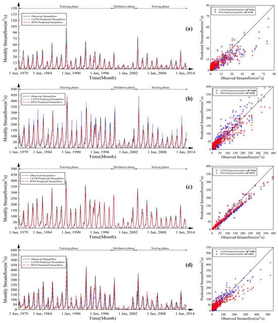 The scatter plot and hydrograph of the RNN and LSTM models for the following stations: (a) Nezamabad station; (b) Bookan Reservoir; (c) Ghezkorpi; and (d) Safakhaneh.