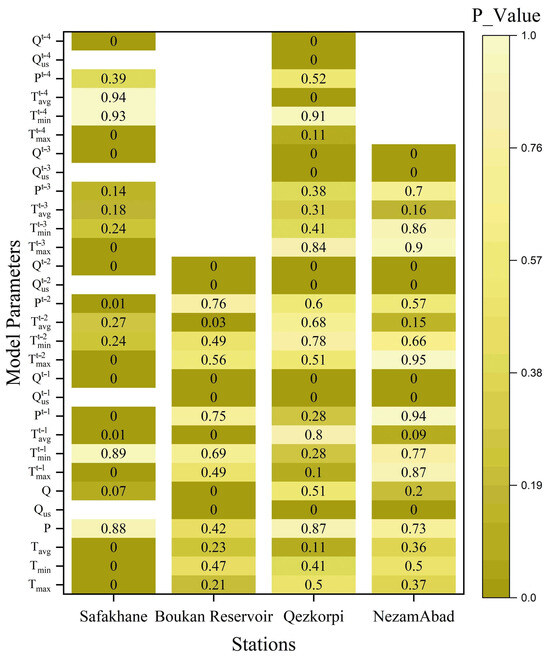 The outcomes of the sensitivity analysis, as determined using one-way ANOVA, are depicted in Figure 7. In contrast to precipitation and minimum and average temperature, which have the least impact on the model’s output, the results indicate that upstream station streamflow, station streamflow, and maximum temperature exert the greatest influence on the model’s output. The downstream streamflow is not included in the sensitivity analysis of the Safakhaneh station; thus, the analysis only shows a great impact on the maximum temperature and the antecedent streamflow of that station. The other three stations not only show high influence on those inputs but also the downstream station of each one of the stations.