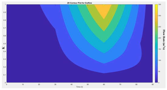 In the present research, the physical assessment of flow in the basin is programmed as per MATLAB 2021b software. The outcomes are demonstrated in Figure 8. In the model, as per the statistical data of the Water Management Organization of Iran, at the evaluated time, the maximum, average, and minimum flows of the Zarrine River basin are considered equal to 560, 250, and 60 m3/s, respectively. Also, the total time and Δt are adjusted to 100 and 30, respectively. In the model, different K values from 0 to 1 are computed in the present model. By concentrating on Figure 8, it can be concluded that the physical state of the basin is computed from 60 to 350 in the time steps, which is seen as the average of different station flows in Figure 6. Therefore, the physical analysis of average stations in the basin is close to the absolute measured values at different stations. Finally, the physical analysis of the basin approves the machine learning outputs of this study as well as the real data of the case study. In general, the contour plot provides a comprehensive visual representation of the dynamics of the outflow, considering the interplay between time and the parameter K in the Muskingum–Cunge method. It helps users understand how adjustments in the parameter K impact the outflow at different time points during the simulation.