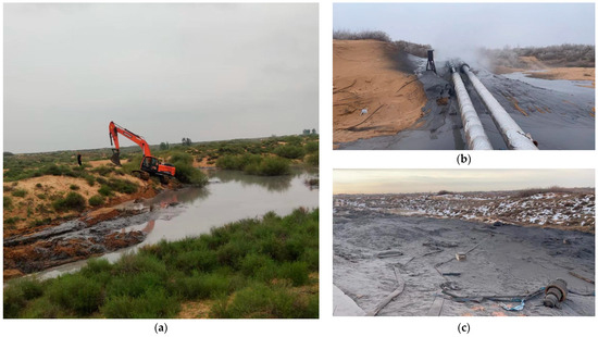 As more and more separation grouting settlement reduction projects were implemented, grouting leakage problems became more valued [26,27,28,29]. However, there is one kind of grout ground leakage case, which occurs during some separation layer grouting projects, which is totally different from previous studies. Grout flows back along the grouting borehole, causing the grout to expand at the surface and large-scale ground grout leakage. Moreover, it often causes pipeline fractures and damage to equipment. When this kind of ground leakage occurs, the progress of the project will be greatly delayed. This phenomenon is very common, especially in the process of separation layer grouting in Muduchaideng coal mine (Figure 1).