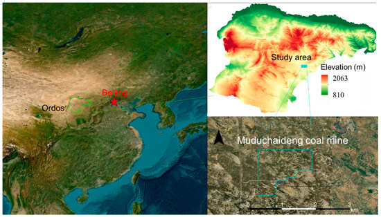 Muduchaideng Coal Mine is located in the territory of Ordos City, Inner Mongolia Autonomous Region, China. Its extreme geographical coordinates are as follows: east longitude: 109°25′29″~109°31′00″, north latitude: 38°47′52″~38°52′25″. The research area is located in the southeast of the Ordos Plateau, with an overall trend of higher terrain in the northeast and lower terrain in the southwest. The elevation ranges from 1296.2 m to 1277.1 m and the maximum terrain elevation difference is nearly 20 m. Figure 2 shows the location of the study area.