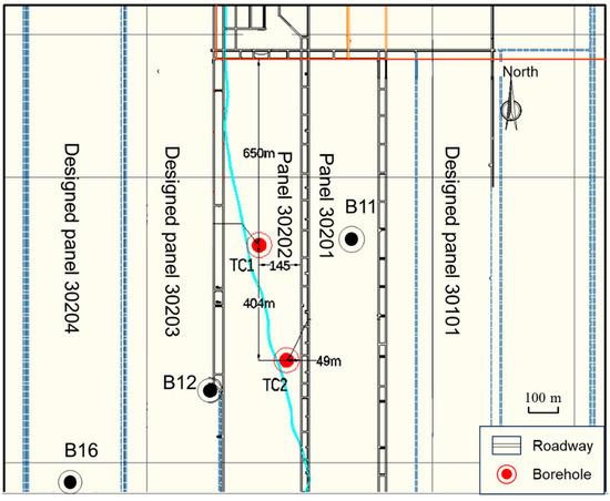 During the implementation of the project, the 30202 panel was used for mining. In order to detect the maximum height of the water-flowing fracture zone and the mining-induced overburden separation, TC1 was arranged in the middle of the 30202 panel. Borehole TC2 was located at least 97 m behind the 30202 panel, close to the maximum subsidence area expected after mining the 30202 panel. The depth of TC1 was 620.66 m and the depth of TC2 was 583.31 m.