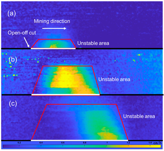 Figure 5 shows the evolution of the velocity field cloud image of the damage to the overlying strata during the excavation of the coal seam. When there is no excavation, the strata remain stable. When the excavation reached 70 cm, the height of the unstable area is approximately 25 cm, corresponding to an actual formation height of 125 m. As excavation continues, the unstable area further develops upwards. When the excavation reaches 120 cm, the height of the unstable area reaches 56 cm, corresponding to an actual formation height of 280 m. With continued mining, when the excavation spacing reaches 160 cm, the height of the unstable area reaches 70 cm, corresponding to an actual formation height of 350 m.
