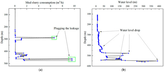 Figure 7a showed the variation in mud slurry consumption with depth during the drilling process. The normal mud consumption during drilling is between 0.02 to 0.04 m3/h, and a consumption greater than 1 m3/h was considered abnormal. When drilling to a depth of 286.64 to 290.55 m, the mud slurry began to leak, with a loss of 6.6 m3/h. After plugging the leak, normal drilling resumed. When drilling to a depth of 415.19 m, the leakage suddenly increased from 0.12 m3/h to 1.44 m3/h. As the drilling continued to a depth of from 422 to 464.91 m, the leak gradually increased, with a total pump loss of 9.6 m3/h, ranging from 461.97 to 464.91 m. After plugging the leakage point again, the drilling continued. From 465 m to 473 m, the leak gradually increased, and at 474 m, it started to leak completely. From 474 m to 536.70 m, various materials, such as sawdust, a high-efficiency sealing agent, limestone powder, and plant glue, were used to plug the leakage. Therefore, it can be inferred that the locations where the crack area occurred were around 286 to 304 m, 415 to 434 m, 461 to 474 m, and there was also a serious collapse area that developed below 474 m due to the complete mud slurry loss.