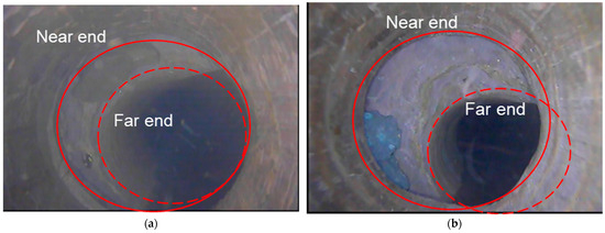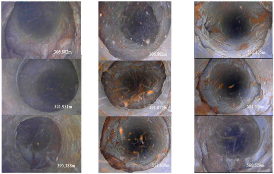 Both downhole television images demonstrated that the borehole walls were relatively intact. However, compared to the first logging, the deformation of the strata was more significant during the second logging, due to mining. Figure 9 showed the deformation of the borehole wall at the depth of 393 m during the first and second logging in the TC1 borehole. In addition, it can also be clearly observed that there were some other forms of damage to drilling holes when conducting an underground television exploration. The damage forms included the following: cracks, dislocation, separation, collapse, block falling, and hole shrinkage. Furthermore, the borehole damage will further lead to the destruction of grouting pipelines. According to on-site statistics, there were three main forms of pipeline failure, which correspond to the borehole failure (Table 3).