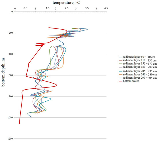 2. The sediment temperature (1.6–2.5 °C) exceeds (0.5–1.5 °C) for bottom depths ranging from 300 to 550 m. Lower sediment layers face temperature increase.