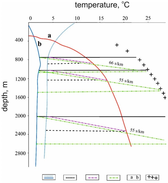 Gas hydrate thickness zone dependence graph on the bottom water temperature, sea depth and temperature gradient in sediment (according to [7], with amendments and additions, redo). 1—sea bottom; 2—the theoretically determined bottom of the methane gas hydrate layer in typically oceanic conditions [66]; 3—the bottom of the gas hydrate layer in the sediments of the Okhotsk Sea; 4—geotemperature gradient; 5—temperature profile: a—oceanic [66], b—Okhotsk Sea; 6—profile of the gas hydrate stability zone in the Okhotsk Sea [7].