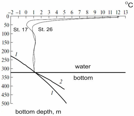 Stability diagram of methane hydrates (100% CH4) found in the Tatar Strait in the water layer (1) and bottom sediments (2—terrigenous pelite with a density of 1733 kg/m3) to 322 m depth. St.17 and St.26—temperature profiles in water at stations 17 and 26 [67].