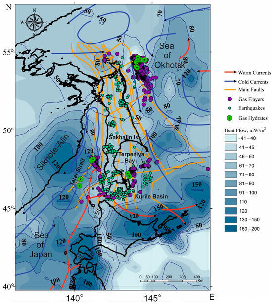 The use of information on heat flows for zoning gas hydrates, mapping anomalies, identifying links with tectonic structures, etc., gives a positive result when constructing a scheme of endogenous regimes, identifying fault–magmatic activation zones, constructing tectonic maps, etc. [7]. In addition, the regional seismic situation is an important factor affecting the mode of gas release from the lithosphere. Our article presents the zoning of gas hydrate provinces based on the geological, geophysical, seismic and oceanographic characteristics of the shelf and slope of Sakhalin Island.