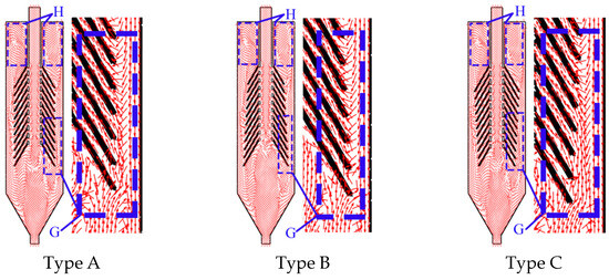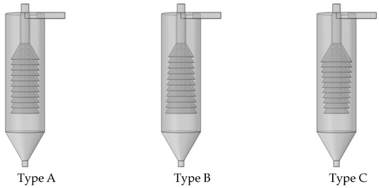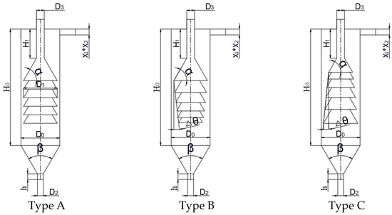 Figure 2 shows the three-dimensional diagrams of three types of cone-plate. Type A is a traditional cone-plate cyclone clarifier. Type B is a gradually expanding cone-plate cyclone clarifier, and Type C is a gradually shrinking cone-plate cyclone clarifier. The dimensional parameters of the different cone-plate configurations are shown schematically in Figure 3. The dimensional parameters are shown in Table 1.
