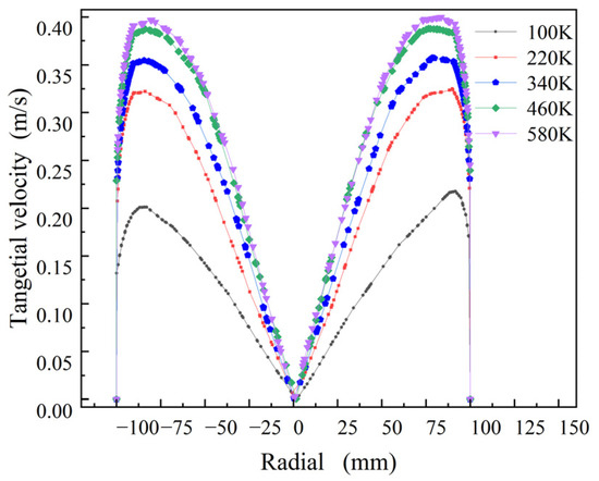 Axial velocity directly affects the movement direction of particles and the separation time within the cyclone clarifier. The size of the axial velocity determines the settling performance of the particles; smaller axial velocities can prolong the time that the fluid stays in the cyclone clarifier and promote the separation of particles in the fluid [31,32].