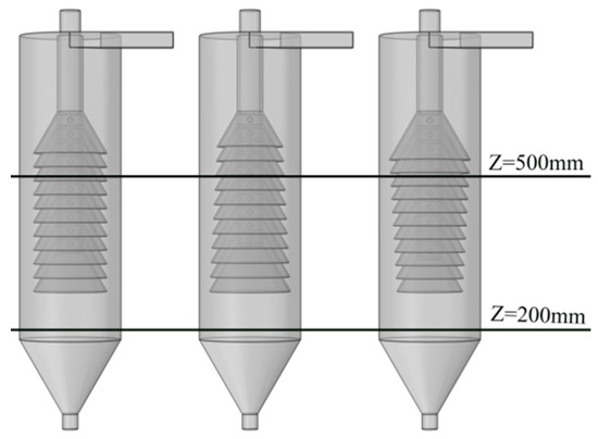 In order to describe in more detail the trend of the velocity change in fluid inside the cyclone clarifiers with different cone-plate structures, the cross-section Z = 500 mm and the cross-section Z = 200 mm were selected to analyze the velocity of the fluid. The location of the cross-sections is shown in Figure 8.