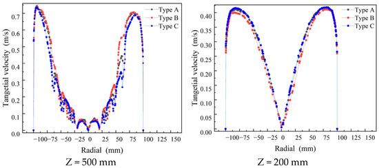 The tangential velocities at the cross-sections are shown in Figure 9. The tangential velocity of the fluid in the cyclone clarifiers with three kinds of cone-plate structures increases rapidly with the decrease in the radius from the wall surface and then decreases gradually. Section Z = 500 mm, due to the existence of the cone-plate, will make the tangential velocity fluctuate within a certain range, but the tangential velocity generally shows a trend of gradually becoming smaller. The tangential velocity in the overflow pipe also increases, then decreases, and reaches the minimum at the center of the axis. The tangential velocities between the plates of the three cone-plate configurations are smallest for the type C cyclone clarifiers and largest for the type B cyclone clarifiers at the cross-section of Z = 500 mm. The small tangential velocity between the cone-plates of the type C cyclone clarifier facilitates the settling of particles on the cone-plates. At the cross-section of Z = 200 mm, the tangential velocity of the fluid in the type C cyclone clarifier is slightly greater than that in the type A cyclone clarifier, and the tangential velocity is the smallest in the type B cyclone clarifier. The larger tangential velocity outside the cone-plate favors the radial separation of particles. Taken together, the cyclone clarifier type C has the strongest cyclone separation ability.