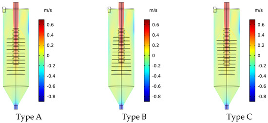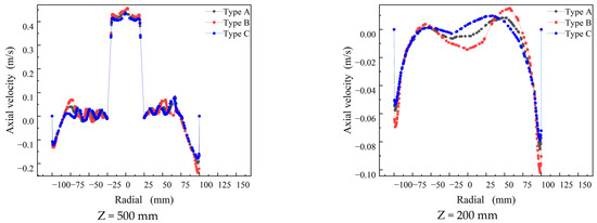 Two cross-sections Z = 500 mm and Z = 200 mm were selected to analyze the axial velocity of fluid in three types of cyclone clarifiers with cone-plate structures, as shown in Figure 11. Near the outer wall of the cyclone clarifier with the cross-section Z = 500 mm and cross-section Z = 200 mm, the axial velocity of the fluid in the type C cyclone clarifier is the lowest. This can prolong the separation time of the particles and reduce the number of particles in the overflow port. At the axial position of the cross-section Z = 200 mm, the area where the axial velocity of the fluid in the type C cyclone clarifier is close to 0 is wider. Lower axial velocities allow for adequate separation of particles and improved effluent quality at the overflow port.