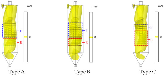 The surface formed by connecting points where the axial velocity is zero is known as the zero-speed envelope surface [33]. Figure 12 shows the zero-speed envelope surfaces of three different cone-plate structures for cyclone clarifiers. Inside the zero-speed envelope surface is the inner vortex flow, and outside the zero-speed envelope surface to the outer wall of the cyclone clarifier is the outside vortex flow.