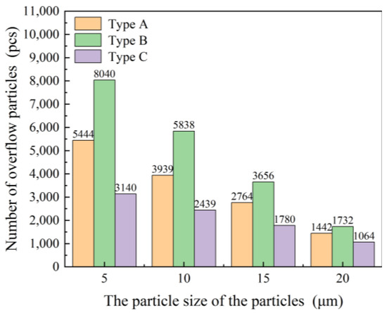 The fluid contains particles with four particle sizes of 5 μm, 10 μm, 15 μm, and 20 μm. Figure 16 shows the number of particles of different particle sizes at the overflow port in three cone-plate configurations of cyclone clarifiers. In the three cone-plate structure cyclone clarifiers, the number of small particles at the overflow are the highest, and the number of particles decrease as the particle size increases. This indicates that large particles are more easily separated and settled by centrifugal force and gravity. The type B cyclone clarifier has the highest number of 5 μm particles in the overflow port, the type A cyclone clarifier has the middle number of 5 μm particles in the overflow port, and the type C cyclone clarifier has the lowest number of 5 μm particles in the overflow port. The removal efficiency of 5 μm particles at the overflow of the type C cyclone clarifier is 11.51% higher than that of the type A cyclone clarifier. This is due to the small tangential velocity of the fluid between the cone-plates in the type C cone-plate cyclone clarifier, which is conducive to the settling of particles on the cone-plate. In the cyclone clarifier outer wall and near the axis, the type C cone-plate cyclone clarifier in the fluid axial velocity is small and is conducive to the full separation of particles. At the same time, the type C cyclone clarifier adopts the cone-plate structure which is gradually becoming smaller from the top to the bottom, forcing the inner vortex flow particles to flow into the cone-plate for secondary settlement. The number of 20 μm particles at the overflow port of the cyclone clarifiers with the three cone-plate configurations were similar. This is due to the fact that large-sized particles receive high centrifugal force and flow directly out of the underflow port with the outside vortex flow. The cone-plate structure has little effect on the large-sized particles. Type C has increased the removal efficiency of 5 μm, 10 μm, 15 μm, and 20 μm particles by 11.51%, 9.99%, 9.83%, and 7.62%, respectively, compared with that of the overflow of the Type A cyclone clarifier. The removal efficiency of all particles at the overflow of the type C cyclone clarifier was increased by 10.32% compared to the type A cyclone clarifier.