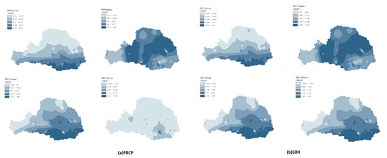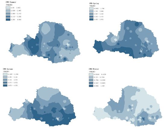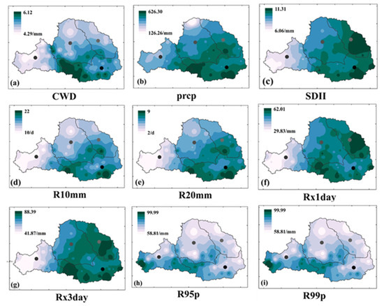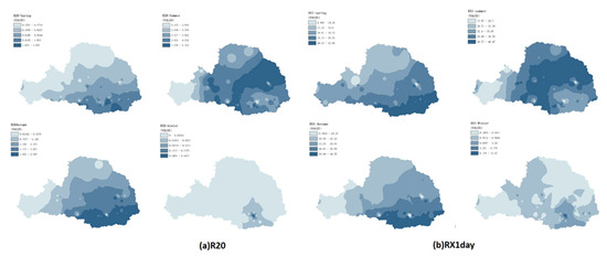 - The extreme precipitation index in most areas of the Wei River Basin showed an overall upward trend, with the most significant change occurring in the Guanzhong Plain region. The temporal variation characteristics of extreme precipitation factors were identified using the non-parametric Mann–Kendall test method. Specifically, most sites show an upward trend in EPIs and are consistent on empty. Among them, the annual variation in seven extreme precipitation indicators (CWD, R95, R99, R1, R10, Rx1day, and Rx3day) at all stations show an upward trend. The stations with an upward trend in the annual variation of the three indicators of R20, PRCP, and SDII account for 98.63%, 54.79%, and 59.8%, respectively. The overall pattern of extreme precipitation changes in four different seasons is consistent. The high values of extreme precipitation are mainly distributed in the southern or central regions, while the low-value areas are mainly in the western region. Among them, the scope and area of high-value areas in summer are more extensive.