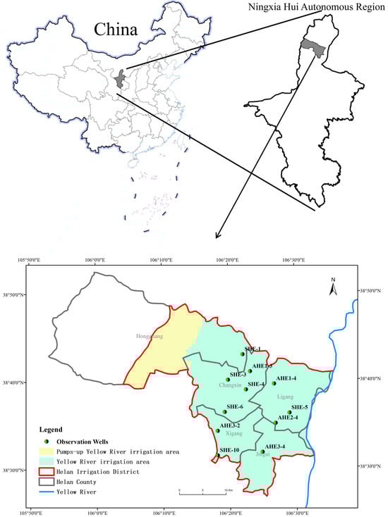 The Helan irrigation district is located in the arid region of the north-central part of Qingtongxia Yellow River Irrigation District, Ningxia Hui Autonomous Region, China, which lies at a longitude of 105°53′ to 106°36′ N and latitude of 38°27′ to 38°52′ E (Figure 1). The precipitation in this region is characterized by a modest annual average of 212 mm, while the evaporation exhibits a substantial annual average of 1313 mm. The study area is characterized by a lack of natural surface runoff, with the surface water system primarily composed of artificial channels and drainage ditches. The availability of surface water resources is limited. The irrigation of regional agriculture is predominantly dependent on artificial channels to draw water from the Yellow River on the western border. The topography of the Helan irrigation district exhibits a southwest-to-northeast gradient, characterized by higher elevations in the southwest and lower elevations in the northeast. The elevation varies within the range of 1102–1122 m. The western part is characterized by higher terrain and serves as a “pumps-up Yellow River irrigation area”. The construction of a water-lifting project in this region is necessary to utilize the water from the Yellow River for irrigation purposes. The eastern part corresponds to the “Yellow River irrigation area”, which is an artesian irrigation area (Figure 1). The primary crops cultivated include rice, vegetables, wheat, and corn. Notably, vegetables and rice, which have high water requirements, constituted a significant proportion of the crop cultivation area in 2017 at 26.16% and 14.42%, respectively [39]. The demand for agricultural water is substantial; however, the annual decrease in water supply from the Yellow River exacerbates the evident disparity between the availability and demand of regional water resources. The spatial and temporal distribution of water resources exhibits non-uniformity, with the coexistence of water scarcity and secondary salinization in this region.