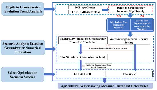 The objective of this study is to facilitate the implementation of water conservation measures while ensuring that the regional groundwater depth remains within the ecological threshold range as far as possible, thereby preventing the salinization and desertification of the irrigated area. Therefore, the Helan Irrigation District in the Ningxia Hui Autonomous Region of China was chosen as the research subject, and subsequently, the threshold values for implementing agricultural water-saving measures were determined. The present study developed a method that integrates trend analysis and scenario analysis based on groundwater numerical simulation to ascertain the threshold for agricultural water-saving measures. The k-Shape method is utilized for clustering the DTG time series data, while the CEEMDAN method is employed to analyze the trend of each cluster. The temporal and spatial characteristics of DTG variations in the study area are investigated to ascertain that agricultural water-saving measures should be strengthened and the water-saving scenario scheme should encompass both engineering and non-engineering water-saving measures. The routine agricultural engineering and non-engineering water-saving measures were integrated into 12 water-saving scenario schemes. By utilizing the control area of ecological groundwater table depth (CAEGTD) and water shortage rate (WSR) as evaluation indices, the optimal scheme was selected through a comparative analysis of numerical simulation results for different schemes, ultimately establishing thresholds for agricultural water-saving measures. The study examines the dual perspectives of maintaining suitable DTG and mitigating WSR. The findings hold significant implications for promoting water-efficient development and ensuring ecological security in irrigated regions.