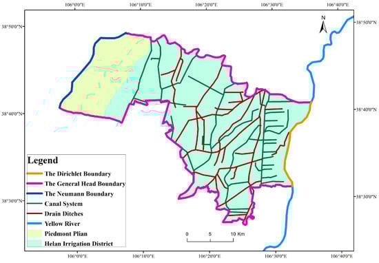 Helan County is situated in the central region of the Yinchuan Plain, with its western boundary adjoining the fault zone at the eastern foot of Helan Mountain. On the eastern side, it is connected to the Ordos block through the Yellow River fault. The model domain includes part of the Piedmont Plain and the whole plain irrigation area in Helan County, and the area is 991.4 km2. The main aquifer is quaternary pore water. In the western region of the model domain, the Piedmont section of the aquifer consists primarily of phreatic water, whereas the plain section comprises both phreatic and confined aquifers within the aquifer system. The implementation of water-saving measures in agriculture has a more immediate influence on the upper aquifer. Therefore, this study focuses on the shallow groundwater in which the aquifer floor is buried 60 m underground [47] and it is generalized into a 1-layer structure vertically in the model. According to the flow field characteristics and stratigraphic structure in the region, the western Helan Mountain frontage is defined as the Neumann boundary, the eastern Yellow River is simplified as the Dirichlet boundary, and the north–south boundary is treated as the general head boundary (Figure 3).