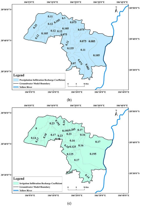 The parameters involved in the model primarily encompass the permeability coefficient and specific yield of the aquifer, precipitation infiltration recharge coefficient, canal system leakage recharge coefficient, and irrigation infiltration recharge coefficient. The values of these coefficients were established based on the results of the third water resources survey and evaluation in Ningxia Hui Autonomous Region. The zoning of the permeability coefficient and specific yield is illustrated in Figure 4a. The determination of the precipitation infiltration recharge coefficient value considers the lithology of the soil aeration zone, the spatial distribution of annual precipitation, and the annual depth to groundwater (Figure 4b). The determination of the irrigation infiltration recharge coefficient value considers the lithology of the soil aeration zone, the spatial distribution of the depth to groundwater during the irrigation period (April to September; November), and the irrigation system (Figure 4c). The determination of the canal system leakage recharge coefficient requires a consideration of various factors, such as the lining rate, canal length, main branch canal, lithology beneath the canal bed, and groundwater depth. It has been determined as 0.197 within this model. In addition, the limiting evaporation depth of groundwater is determined to be 3 m, as the dominant lithology of soil in the majority of the study area is clay sand.