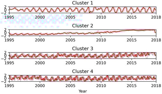 The elbow method refers to the point at which the ‘Distortion’ abruptly decreases and then stabilizes, indicating the optimal number of clusters. According to the elbow method of clustering analysis, the 11 groundwater observation wells in the Helan Irrigation District can be classified into four clusters by using the k-Shape method (Figure 5). The DTG variation in the observation wells within each cluster exhibits a consistent trend from January 1995 to December 2018 (Figure 6).