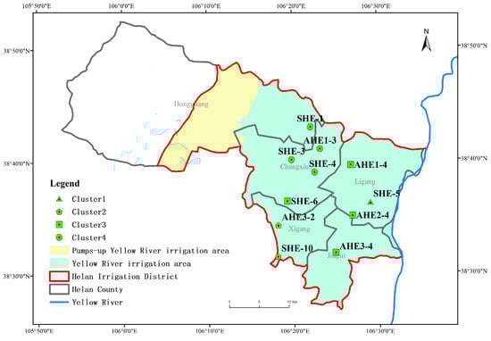 The groundwater observation wells within each cluster exhibit distinct spatial zoning characteristics. Cluster 1 comprises well SHE-5, situated in the eastern part of the irrigated area and adjacent to the Yellow River. Cluster 2 consists of wells AHE3-2 and SHE-10, located in the southwest near the urban area of Yinchuan. Cluster 3 encompasses wells AHE1-4, AHE2-4, AHE3-4, and SHE-6, positioned in the central region of the irrigated area. Lastly, cluster 4 includes wells AHE1-3, SHE-1, SHE-3, and SHE-4, which are found in the northwest (Figure 7).