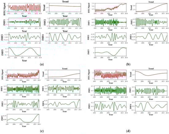 (2) Via the CEEMDAN method, the DTG variation of cluster 1 remains relatively stable over 24 years; cluster 2 exhibits stability before 2003, followed by a rapid increase thereafter; cluster 3 demonstrated stability before 2003 and subsequently displayed a gradual upward trend; cluster 4 experienced a slow decline from 1995 to 2003, but underwent an increase post-2003.