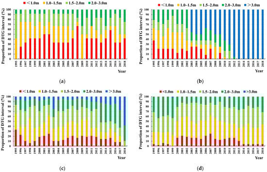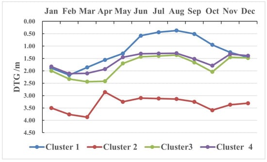 The trends in monthly average DTG data for four cluster observation wells from 1995 to 2018 were analyzed using the CEEMDAN method. The proposed method utilizes the DTG data as a time series signal and decomposes it into multiple intrinsic mode functions (IMFs) along with a residual signal. Notably, the residual signal exhibits trends consistent with the original signal. The results indicate that the DTG variation in cluster 1 remains essentially stable, while in cluster 2 it is stable before 2003 and exhibits a rapid increase thereafter. In cluster 3, the DTG variation remains stable before 2003 and shows a gradually increasing trend afterward. As for cluster 4, it experienced a slow decrease from 1995 to 2003 followed by an increase after that period (Figure 8). Furthermore, the evidence provided by the DTG interval proportions of these four clusters from 1995 to 2018 supports the aforementioned findings (Figure 9).