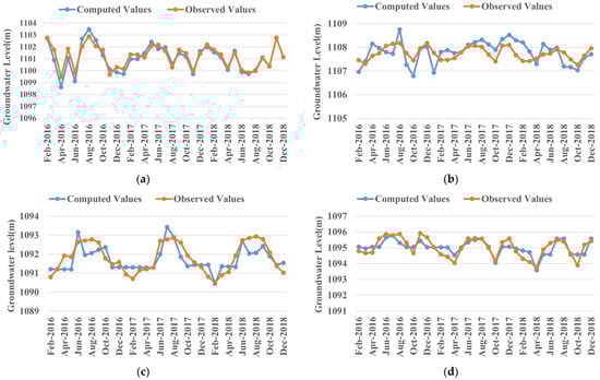 Comparison of computed and observed groundwater levels in some observation wells. (a) Denotes AHE2-4, (b) denotes SHE-4, (c) denotes SHE-5, and (d) denotes SHE-6.