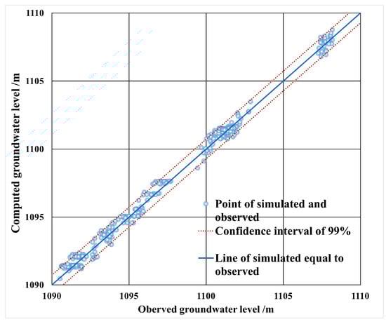 All source and sink items from January to December 2018 are inputted into the model to assess the suitability of the selected parameters. The comparison between the observed and simulated groundwater levels of some observation wells is shown in Figure 10. An error analysis was performed by employing the observed data and simulated results from 11 groundwater observation wells (Figure 11). The observed and computed values of the groundwater table level demonstrate an R2 of 0.993 and an RMSE of 0.43.