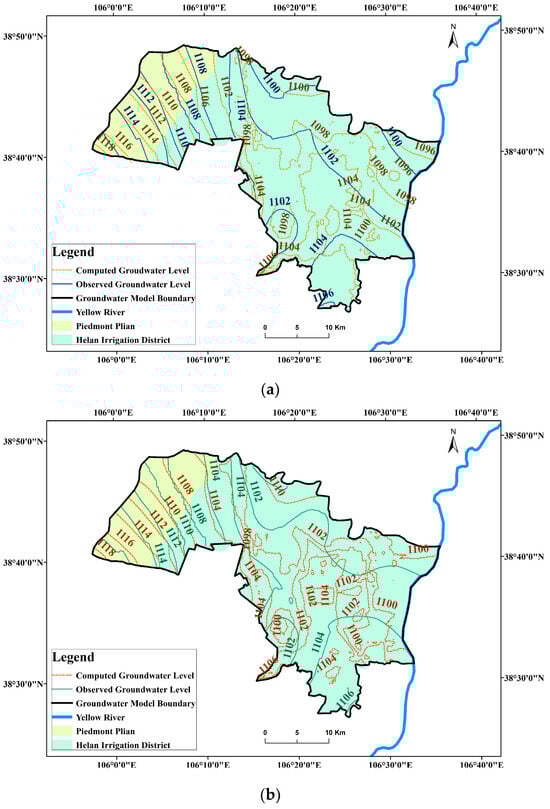 The following technique is employed to facilitate the conversion of various water-saving schemes into groundwater recharge terms within the MODFLOW model. The water demand and supply for each water-saving scenario scheme were calculated based on the established agricultural irrigation water allocation model [42]. The water supply represents the amount of water diverted from the Yellow River in the canal system. The groundwater recharge amount from canal system leakage was obtained by multiplying the water diversion of the canal system with the canal leakage recharge coefficient, and it was incorporated into the MODFLOW model as “Specified Flow”. The water supply multiplied by the canal water utilization coefficient is the amount of farmland irrigation. This quantity was then multiplied by the coefficient for irrigation infiltration recharge, representing the amount of groundwater recharge through irrigation. It was transformed into a recharge rate format and incorporated into the MODFLOW model using the RCH package. The meteorological conditions of precipitation, evaporation, and groundwater exploitation in the model remained unchanged. Therefore, the dynamics of groundwater level are primarily influenced by the recharge of groundwater from canal system leakage and irrigation infiltration. Subsequently, the groundwater numerical simulation of each water-saving scenario scheme was carried out to obtain the groundwater level after the implementation of each scheme.