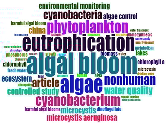 This review includes data from experimental research completed over the last 50 years, from 1973 to 2023. We conducted a thorough search of the literature through Scopus, including terms such as “biological control”, “algal bloom control”, “HAB mitigation”, and “natural algae predators”. Figure 1 illustrates the prevalent terms found in the studies. It is apparent from the figure that the term “algal bloom” was the most frequently utilized in the articles, appearing over 140 times. Following closely was the term “algae”, mentioned approximately 120 times, and “eutrophication”, cited around 115 times. The frequency gradually decreases for other terms, with words like “temperature”, “physiology”, and “humans” being among the least common, each occurring about 15 times, maintaining a similar pattern of presentation.