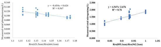 - Under the GF-5 satellite data, the inverse models of total phosphorus and total nitrogen were constructed by using the ratio band method; the R2 values were 0.567 and 0.765, respectively, and the RMSEs were 0.008 mg/L and 0.143 mg/L, respectively. In a precision evaluation, the R2 values of the two test models reached more than 0.8, and the MAPEs were 4.511% and 4.577%, respectively, indicating small errors. Thus, the ratio band model can be used to estimate total phosphorus and total nitrogen levels in Dianchi Lake.
