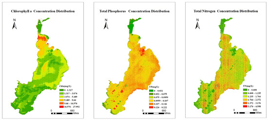 - From the point of view of the spatial distribution, chlorophyll a in Dianchi is mainly distributed in the northern part of the lake, and phosphorus and nitrogen levels are high throughout the water body, with the highest levels in the central and southern parts of the lake. These results indicate that hyperspectral remote sensing data can provide valuable information, spectral data, and band combinations for the retrieval of water quality parameters. The results in this paper further confirm the feasibility of using GF-5 satellite AHSI data for the retrieval of water quality parameters, which is important for relevant departments seeking to perform rapid and efficient monitoring of the water environmental quality of inland lakes.