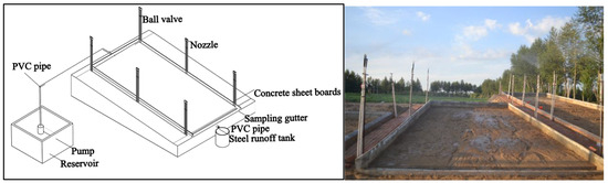 The simulated rainfall experiment involved three rainfall intensities (75, 50, and 25 mm h−1) and four slope gradients (8.7%, 17.6%, 26.8%, and 36.4%). A rake was used to level and roughen the slope surface. To ensure consistent initial moisture content on the slope, rainfall at an intensity of 20 mm h−1 was applied until the initial generation of runoff 12 h before the actual rainfall. One hour before the start of rainfall, dissolved urea was evenly sprayed on the slope. The amount of urea applied followed local corn planting standards, amounting to 0.03 kg m−2. The simulated rainfall was conducted at 6 a.m. to eliminate the influence of wind.