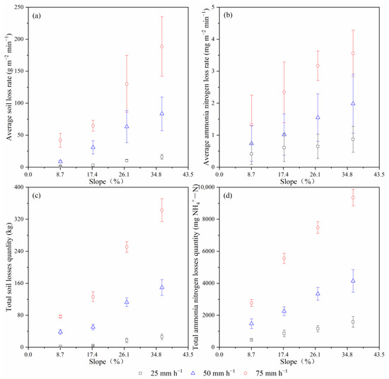 Responses of soil loss rate and ammonia nitrogen loss rate to the slope gradient and rainfall intensity: (a) soil loss rate; (b) ammonia nitrogen loss rate; (c) total sediment losses; (d) total ammonia losses.