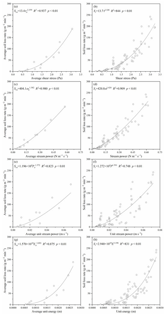 Average soil loss rate and soil loss rate as a function of the flow hydraulic parameters: (a,b) shear stress; (c,d) stream power; (e,f) unit stream power; (g,h) unit energy.