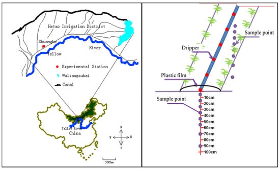 Map of the study area and experimental observation. The left image shows the location of the research area. The red dot refers to the experimental station, the blue area refers to the Wuliangsuhai, and the fold lines refer to the canals. The right image shows the relative positions of the dripper, plastic film, and sample point location. The soil is divided into eight layers for sampling, including 0–10 cm, 10–20 cm, 20–30 cm, 30–40 cm, 40–50 cm, 50–60 cm, 60–80 cm, and 80–100 cm, respectively.