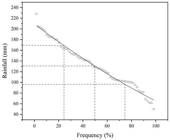 The results showed that the rainfall in the study area changed greatly from 1957 to 2014. The year with abundant water appeared in 1990, with a frequency of 25% and a rainfall of 163.2 mm. The maximum rainfall occurred in 1967, with a frequency of 1.69% and a rainfall of 228.2 mm, which was 65 mm higher than that in the high flow year with a frequency of 25%. In 2012, the rainfall in the study area reached 152.4 mm with a frequency of 32%, which was 11 mm lower than that in the high flow year. The recurrence period was 3.8 years, which could be regarded as a high-flow year. The year with normal water appeared in 1985, with a frequency of 50% and a rainfall of 128.3 mm. In 2013, the rainfall in the study area was 106.9 mm, with a frequency of 64%, which was 22 mm lower than that in the normal flow year. The recurrence period was 3.4 years, which could be regarded as a normal flow year. In 1963, the rainfall reached 74.58 mm with a frequency of 75%. The special low-flow year was 2011 with a rainfall of 50 mm. In 2014, the rainfall was 65.4 mm and the frequency was 93%, which was 9.18 mm lower than that in the 75% low-flow year. So, 2014 could be regarded as a low-flow year with a recurrence period of 16 years. The frequency curve is shown in Figure 2.