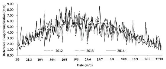 Reference evapotranspiration during the crop growth period in 2012, 2013, and 2014.