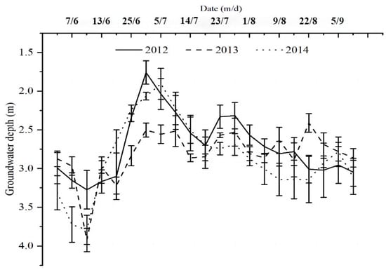 Groundwater changes during the growth period in the study area from 2012 to 2014 were indicated in Figure 4. It could be seen that the overall variation of groundwater in the three years was similar and that the variation trend was affected by irrigation or rainfall. The minimum and maximum groundwater depth in 2012, 2013, and 2014 were 1.74 m on 29 June, 3.26 m on 9 June; 1.74 m on 21 August, 3.94 m on 9 June, and 1.9 m on 5 July, 3.78 m on 9 June, respectively. The maximum groundwater depth appeared in early June, given that a lot of spring irrigation in well-irrigated areas led to deeper groundwater in the heading stages of wheat and maize. Then, the groundwater became deeper gradually during the crop growth period with the average groundwater being shallower in the high-flow year than in the low-flow year.