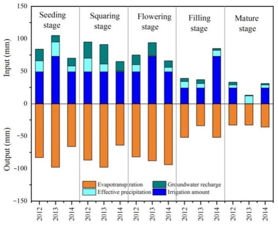 Water balance of root zone at growth stages in 2012, 2013, and 2014.