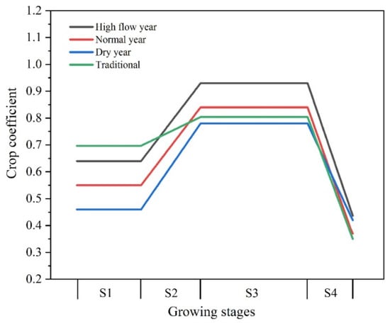 The calculation of the coefficient in different hydrological years is exhibited in Table 3. Reference evapotranspiration was obtained using the FAO 56 PM method, while actual evapotranspiration was determined by the water balance method. The crop coefficient was determined by actual evapotranspiration dividing reference evapotranspiration.
