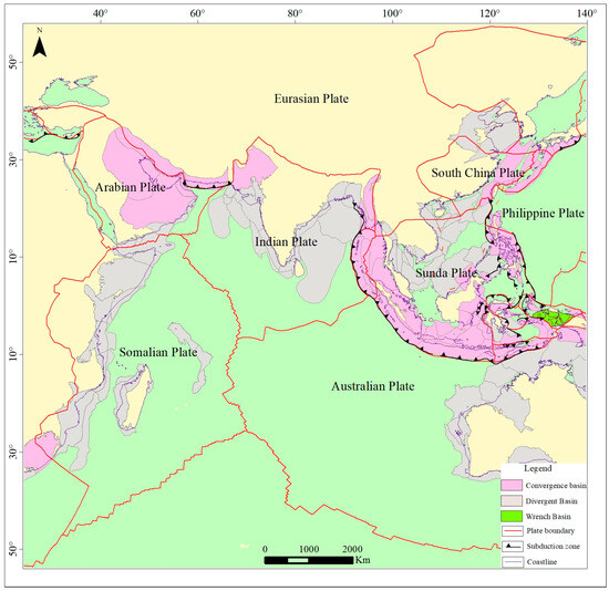 The Silk Road mainly includes the Indian Ocean coast and Southeast Asia, involving the Asia Pacific, East Africa, and other regions, with numerous sedimentary basins developed. The prevailing structural configuration of the Silk Road basins is attributed to the fragmentation of the Gondwana supercontinent, commencing during the Jurassic period. This process originated from the collision of the Eurasian Plate, the Indo-Australian Plate, and the Pacific Plate. This geological evolution involved intricate phenomena, including complex faulting, separation events, the effusion of basaltic lavas, and collision occurrences [24,25]. These processes collectively resulted in the formation of complex structural patterns. The geological record of this region is replete with consequential tectonic episodes, such as supercontinent breakup, seafloor spreading, and collision-related orogeny, leading to diverse plate boundaries encompassing divergent, convergent, and transform margins. Consequently, this region stands out as one of the most tectonically active areas globally [26,27,28].