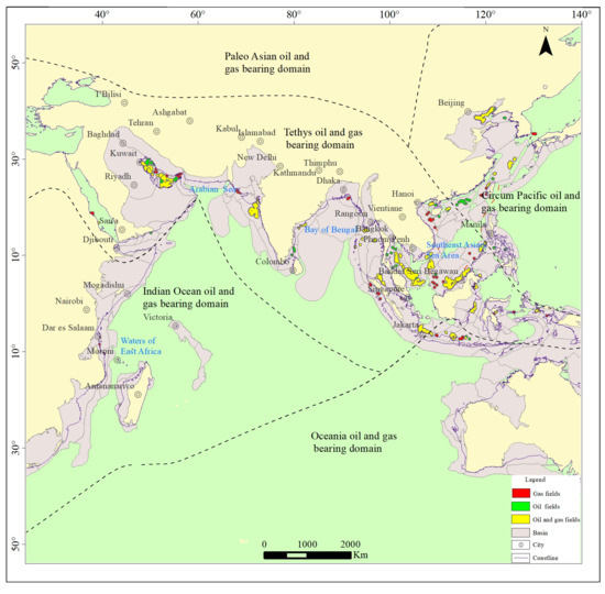 The distribution of oil and gas resources in Southeast Asian waters primarily centers on Thailand, Malaysia, and Indonesia [30,31]. Thailand’s oil and gas resources are predominantly dominated by natural gas, primarily concentrated in the Gulf of Thailand basin. Currently, Thailand supports nearly 120 active oil and gas fields, with over half of them located offshore. Key fields, including the Benchams Oil Field, Plamuk Oil Field, Jasmine Oil Field, Arthit Gas Field, and Pailin Gas Field, are all situated within the Gulf of Thailand basin [32]. Malaysia’s principal oil and gas areas encompass the Gulf of Thailand-Malay Basin, the Sarawak Basin, and the Sabah Basin. These regions hold undiscovered oil resources amounting to 480 million tons and untapped natural gas resources of 360.9 billion cubic meters. Indonesia, rich in oil and gas resources, features predominantly onshore oil reserves, while over 70% of its natural gas resources are situated offshore, primarily within the Natuna Sea and the East Kalimantan Sea. Additionally, the offshore region shared by Indonesia and East Timor equally boasts substantial oil and gas resources.
