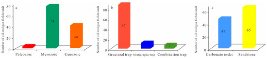 Characteristics of oil and gas fields along the Silk Road ((a) the geological age of the reservoir; (b) trap types of oil and gas fields; (c) the lithology of the reservoir).
