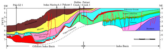 Geoseismic section from onshore Lower Indus to deep offshore Indus [43].